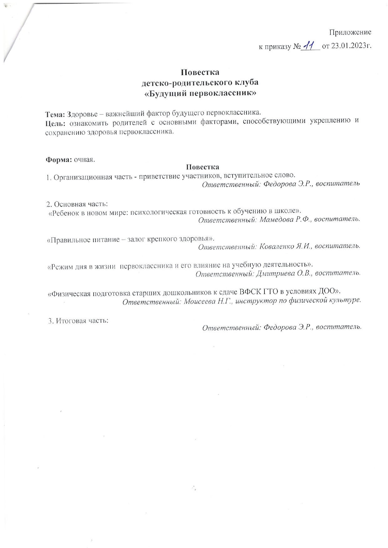 Приказ о проведении заседания детско-родительского клуба