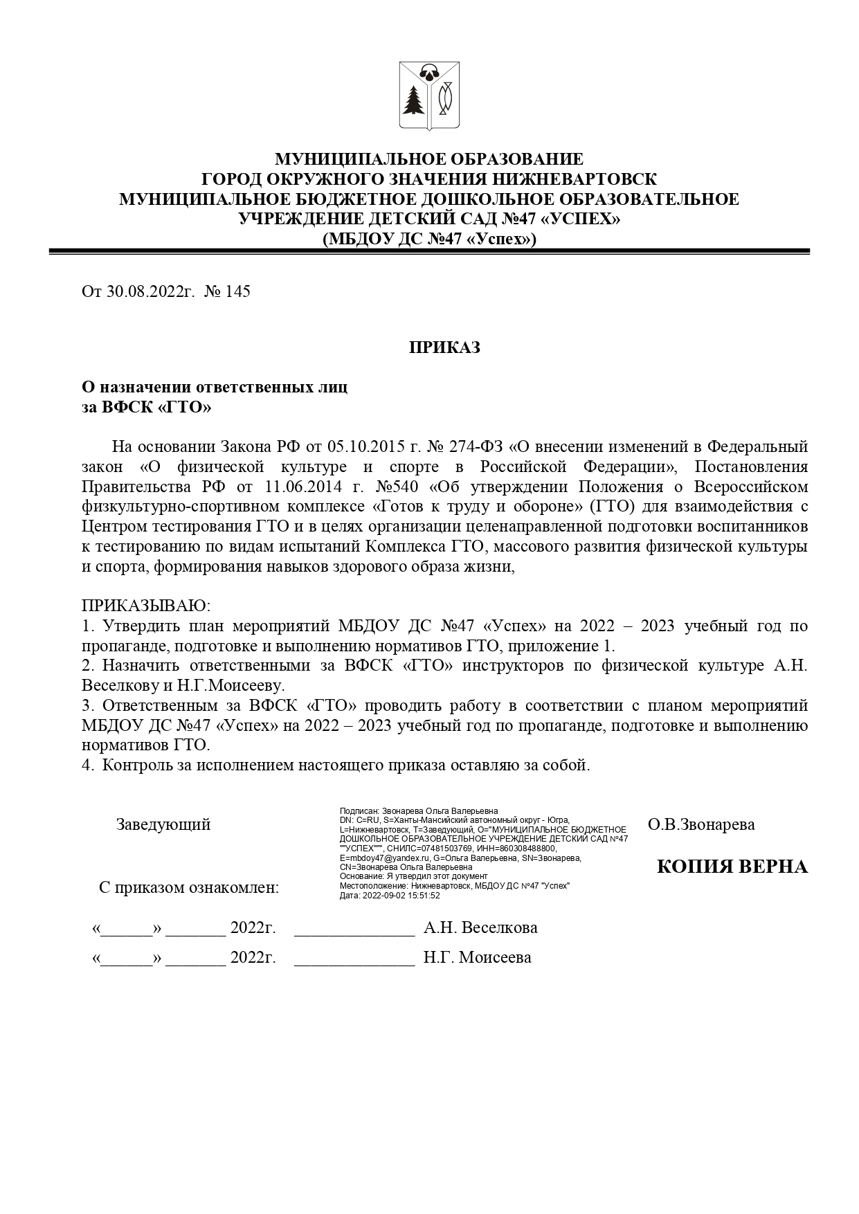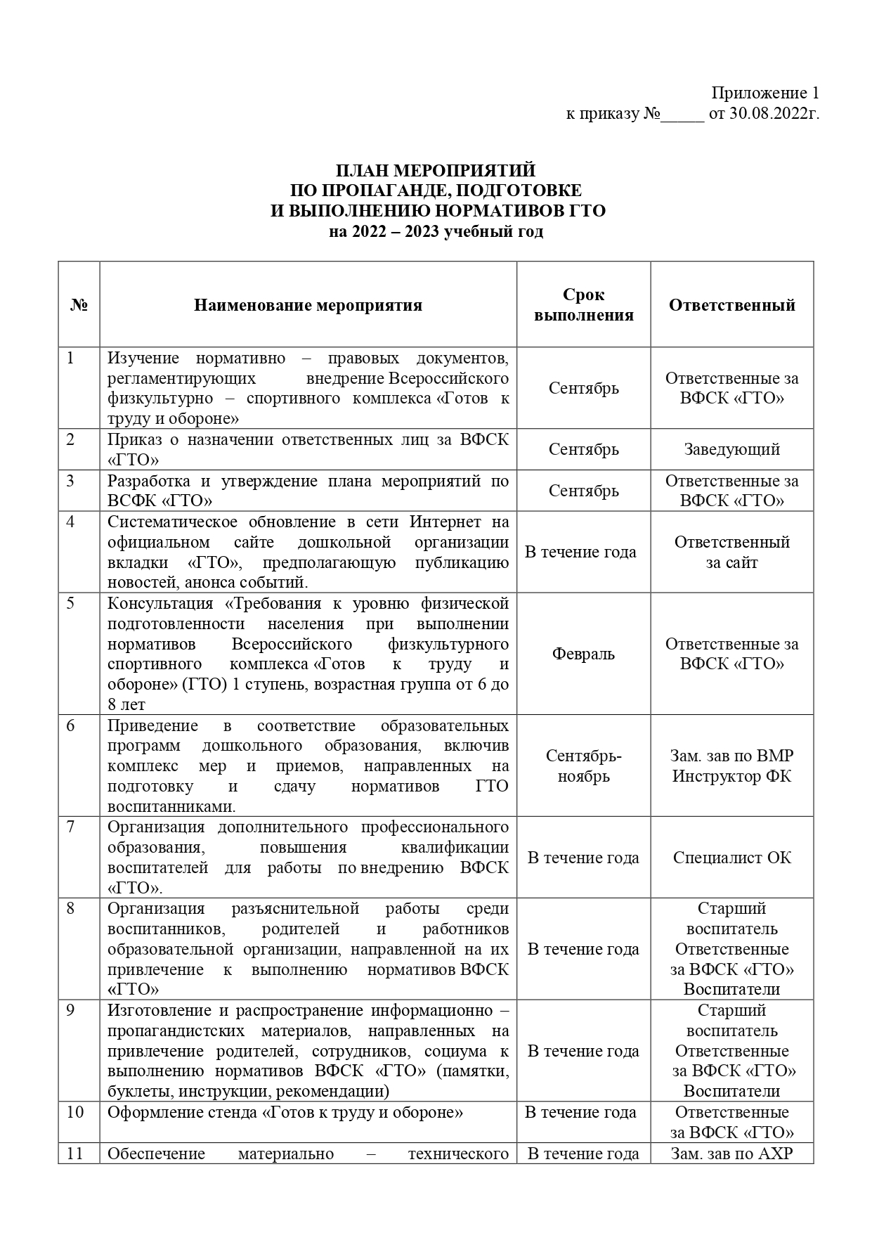 Приказ о назначении ответственных за ГТО