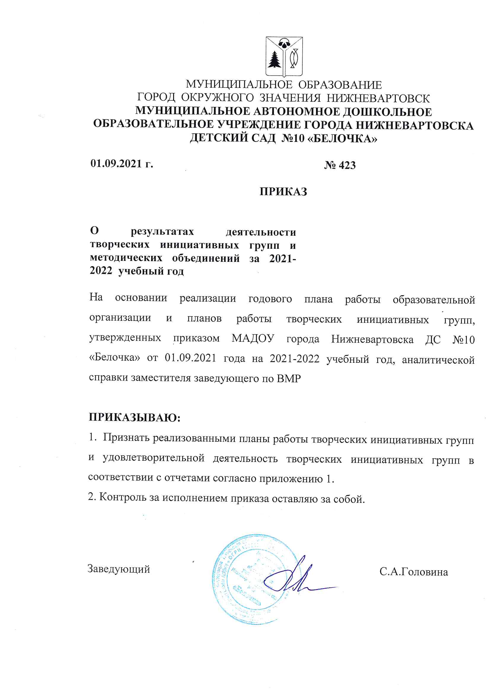 Приказ о результатах деятельности ТИГ