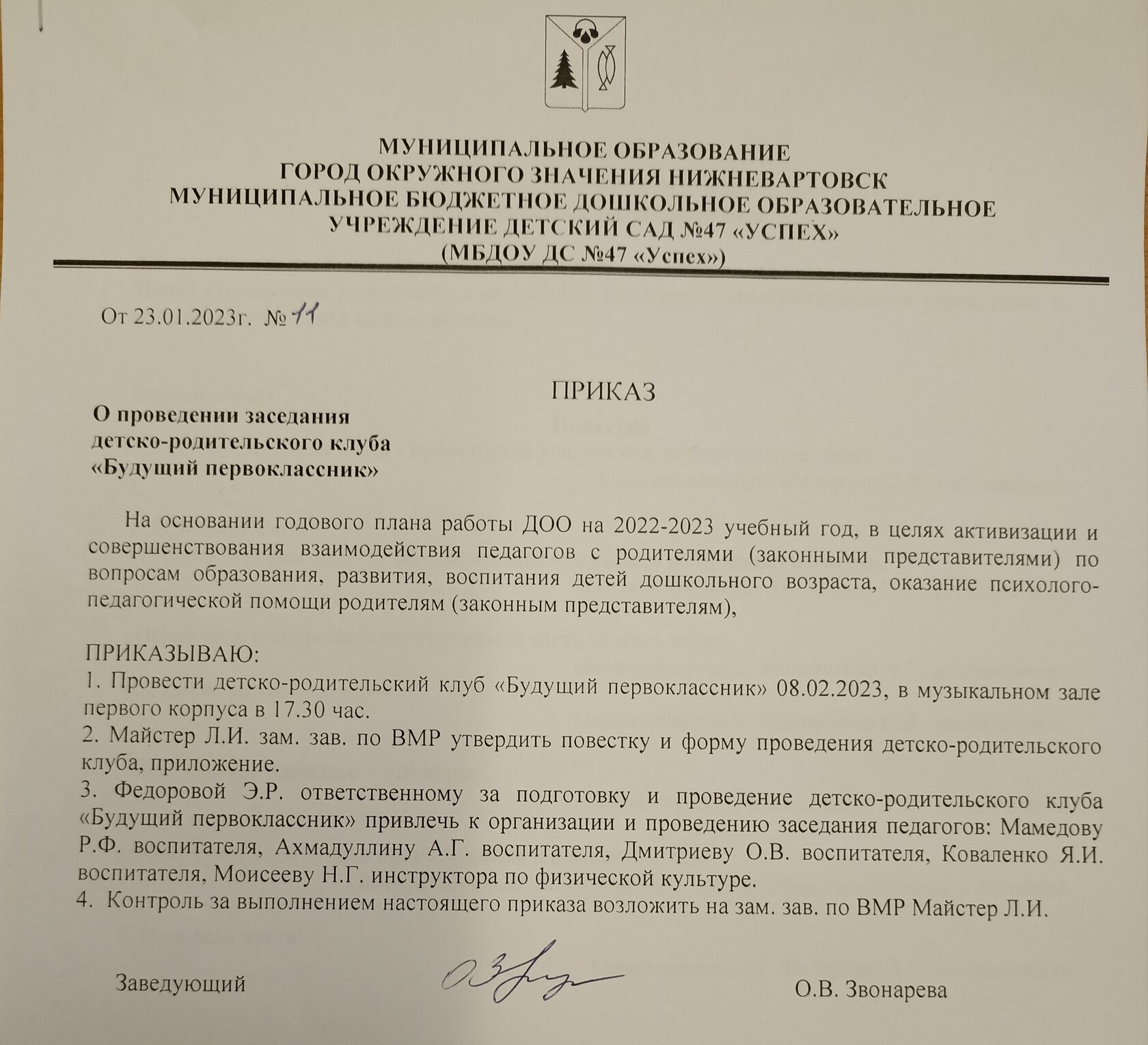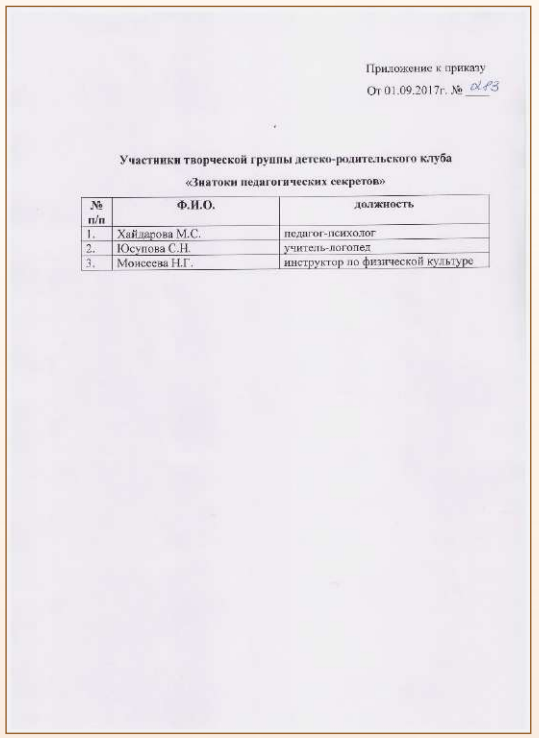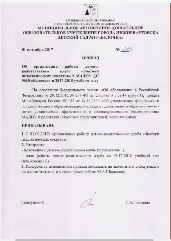 Приказ об организации работы детско-родительского клуба